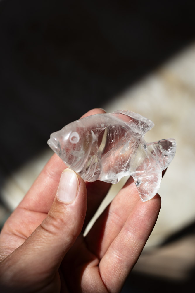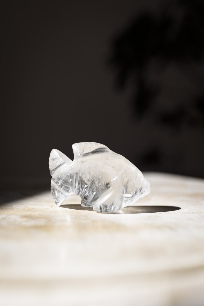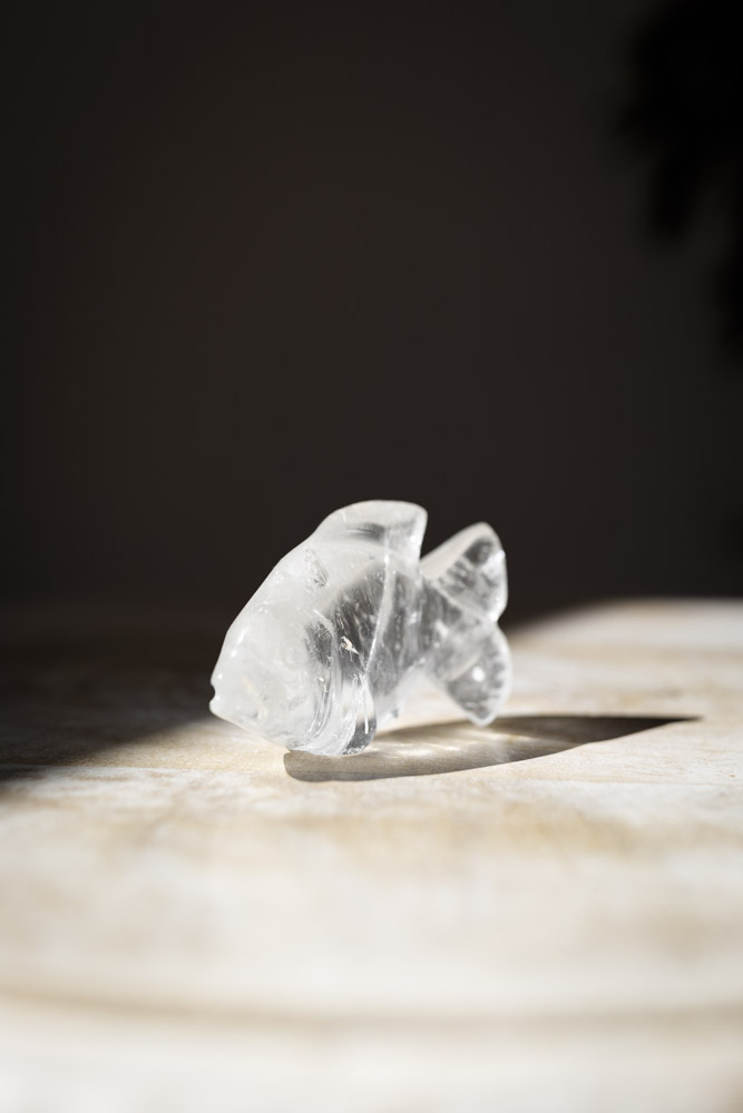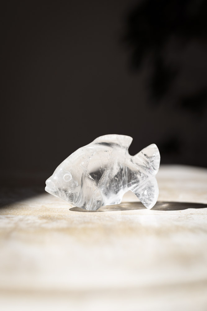 Beskrivelse: denne fiskefigur af bjergkrystal, med sin strålende klarhed, er en ægte perle, der udstråler lys og renhed. Bjergkrystal er kendt for sin evne til at frigøre og rense energi, hvilket gør det til en uundgåelig del af enhver krystalsamling. Fisken, med sin klare kvalitet, er perfekt til at opløse blokeringer og bringe lys til områder, hvor der er stagnation.