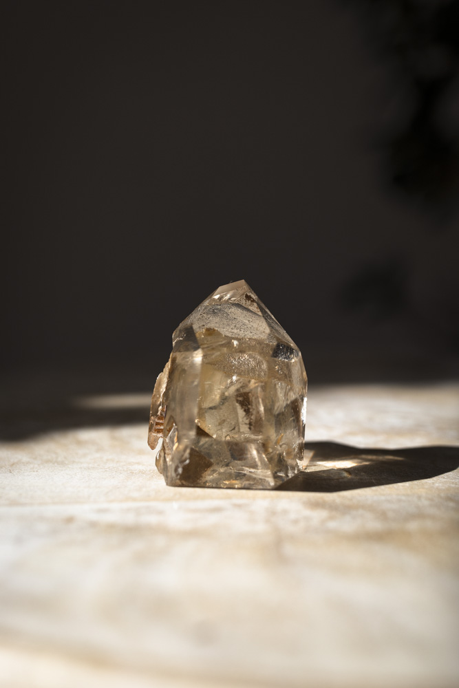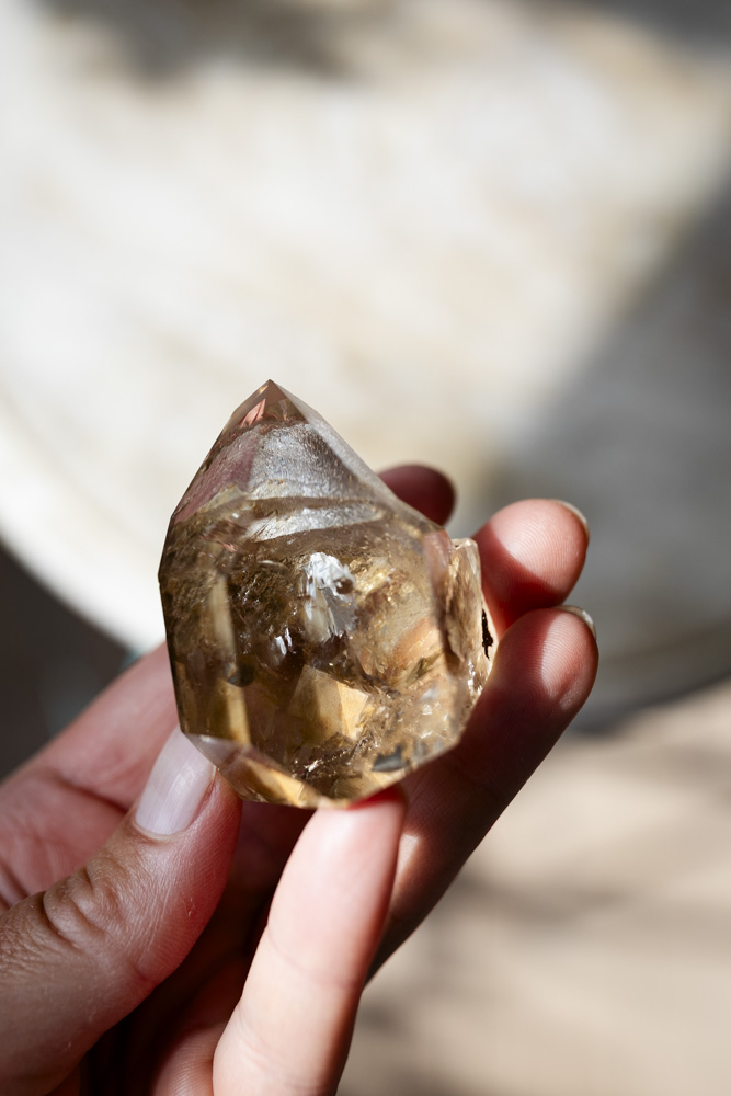 Beskrivelse: naturlig citrin er en gylden kvarts, der skinner som sollys fanget i sten. Den har en varm, gylden nuance, der spænder fra lys honninggul til dybere ravtoner. Den består af kvartskrystal med naturlige spor af jern og varme fra jorden – en sjælden og uforarbejdet variant, som emmer af solenergi. Farven skyldes, hvordan lyset brydes i samspil med naturlige jernspor og varme fra jordens indre.