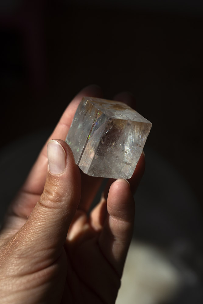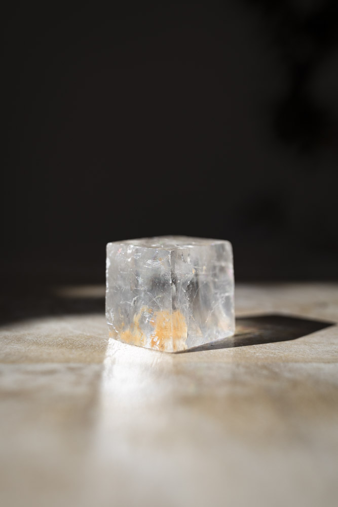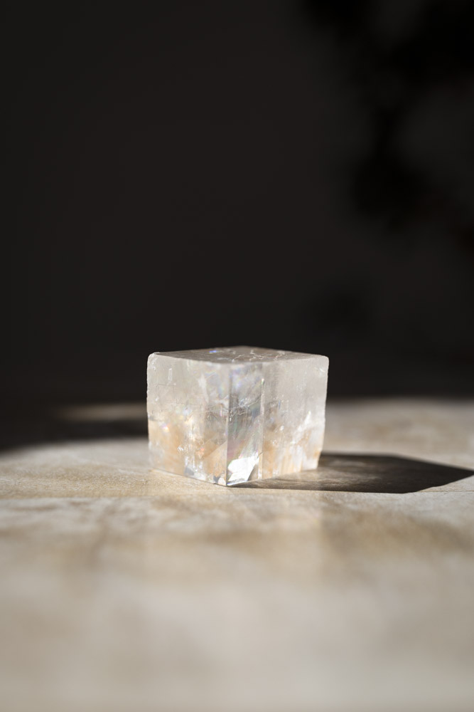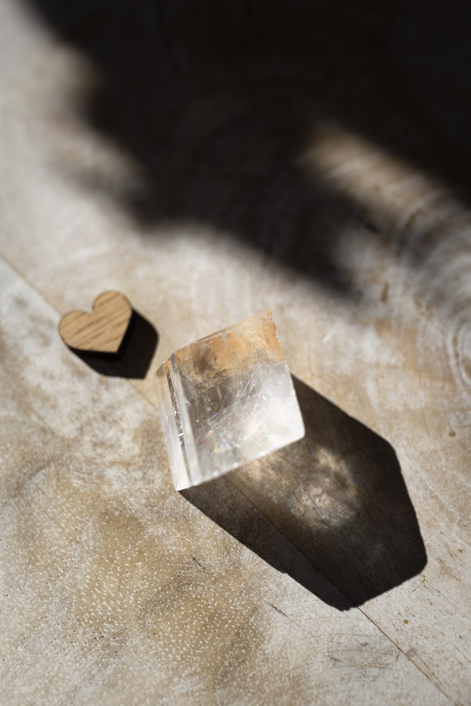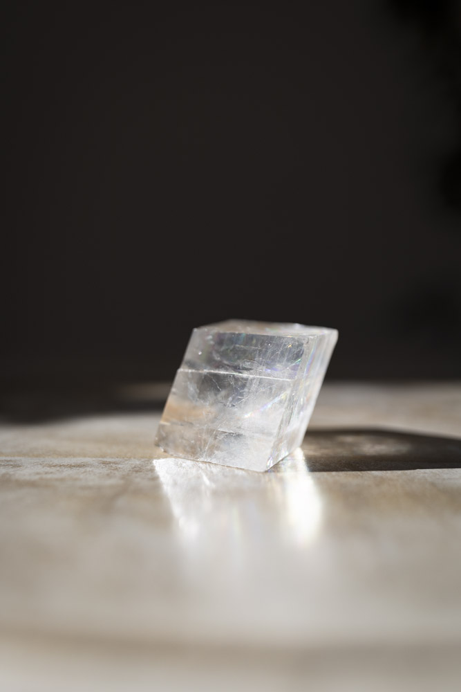 Beskrivelse: optisk calcit, også kendt som islandsspat, har en fascinerende historie, hvor den siges at have været brugt af vikinger til navigation på grund af dens evne til at polarisere lys og finde solen, selv på overskyede dage. Denne klare krystal, med sin evne til at bryde lys i spektakulære regnbueeffekter, er ikke kun et æstetisk vidunder, men også en kraftfuld energisten.